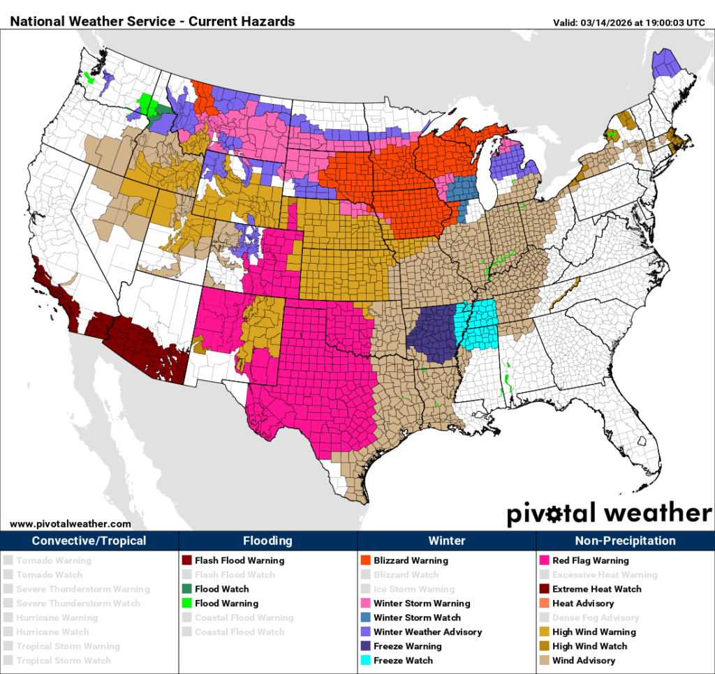 Also note the huge area of red flag and wind advisories in the Plains. We are seeing a wildfire disaster in the making, and we will be fortunate if we do not see one. And that blizzard is now highlighted in the Midwest.
