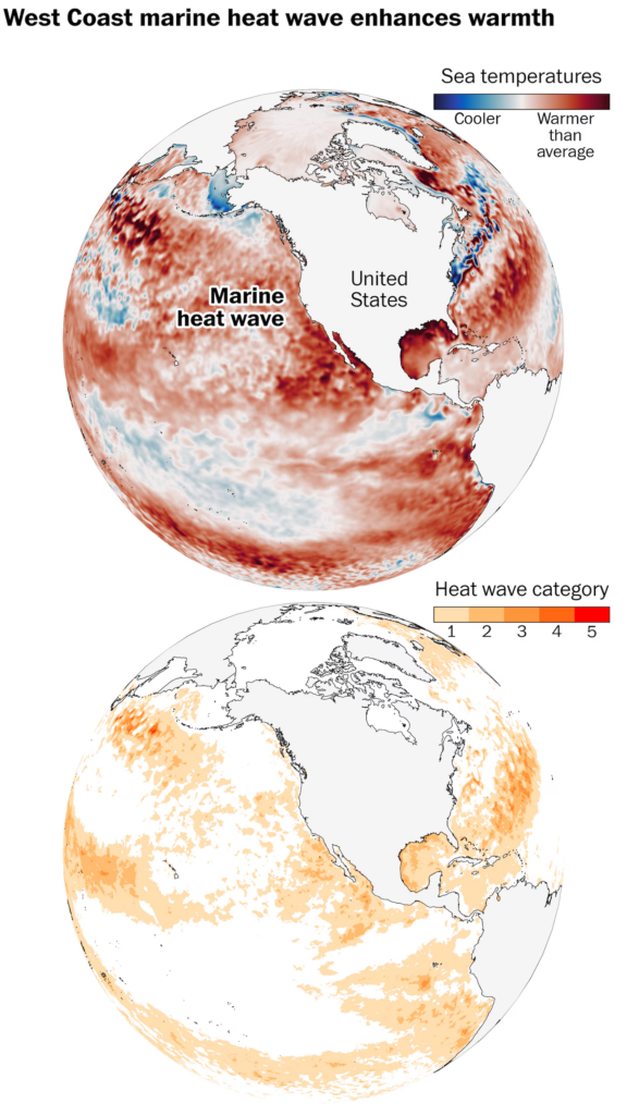 A marine heat wave will enhance warmth near the West Coast during the upcoming spell of record-breaking temperatures. The marine heat wave will also intensify further because of the heat dome. (Ben Noll/The Washington Post; NOAA/OISST/CRW)