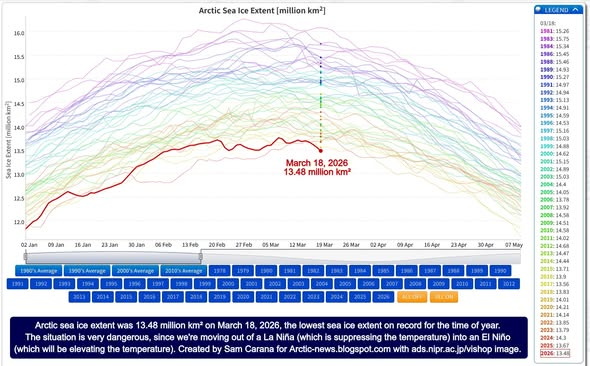 Arctic sea ice extent was 13.48 million km² on March 18, 2026, the lowest extent on record for the time of year.