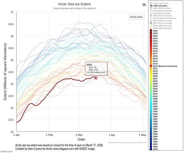 The third image below shows that on March 17, 2026, Arctic sea ice extent was 14.229 million km², the lowest extent on record for the time of year.