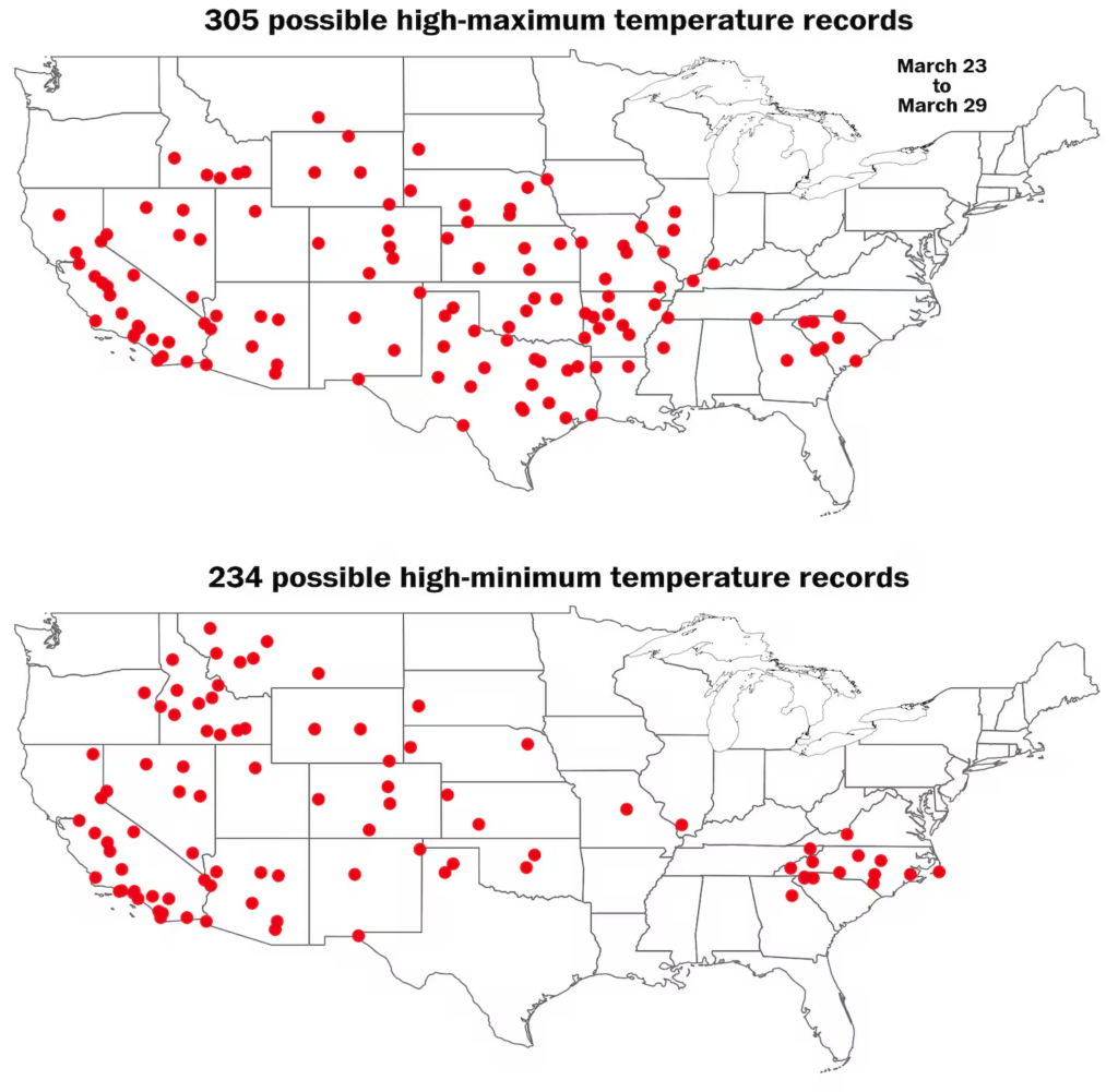 14 new state March heat records have potentially been breached in this #heatwave! That’s stunning. Even 1 or 2 is rare. 14 – I’ve never seen that before.These records were compiled by Climatologist M. Herrera and will still need to be validated by NOAA to be considered official.