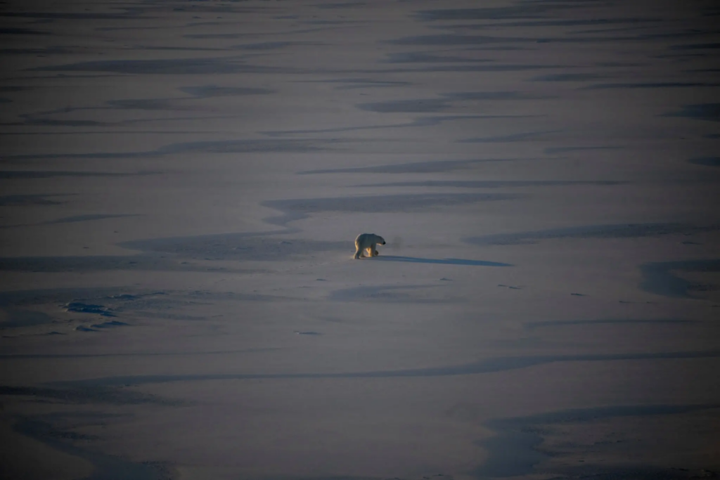 The disappearing ice also affects wildlife habitat. A polar bear on Norwegian sea ice last April. Credit…Olivier Morin/Agence France-Presse — Getty Images